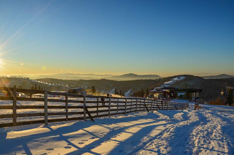 No to schodzę. Narciarze i deskarze zjeżdżają, ja ostrożnie poruszam się skrajem, a że szlak kluczy, przecina stok i o orientację w tłumie zjeżdżających jest trudno, na zejściu zastaje mnie zachód słońca.