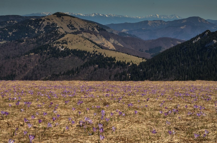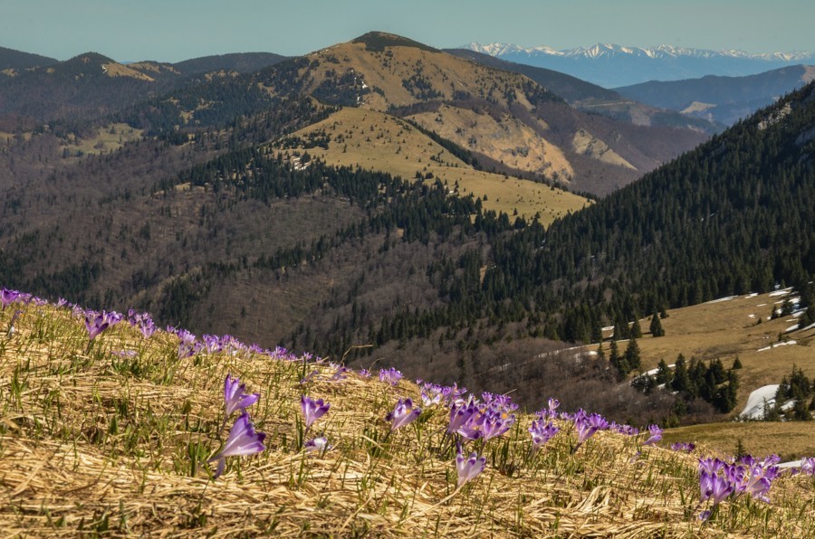Od przełęczy zaczyna się najprzyjemniejsza część wędrówki. Zbocza płaskiej i obłej Płoski pokryte są krokusami, które występują tu w jeszcze większej ilości niż wczoraj na Zvoleniu.