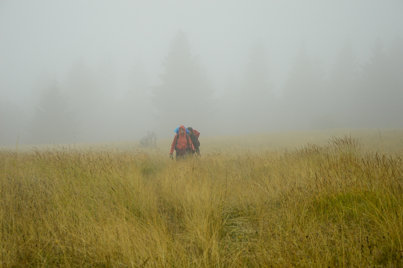 Potem jest leśna wędrówka, a las, który przemierzamy, bardzo nam się podoba. Niekiedy marszruta we mgle jest ciekawsza niż chodzenie wśród drzew przy pogodzie i to jest zdecydowanie ta sytuacja. Gdyby jeszcze buty były suchsze…