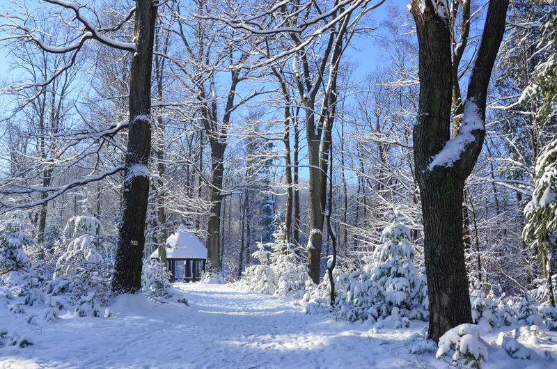 Jest mroźnie, więc raźnie ruszam przed siebie, by rozgrzać się szybkim marszem. Bardzo przyjemnie idzie się ośnieżonym lasem; po ostatnich roztopach to milusi widok!