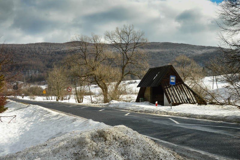 Parkujemy w okolicach hotelu i drogą podchodzimy do parkingu pod lasem przy drodze na Tarnawę Niżną. W innej porze roku poszlibyśmy ścieżką wzdłuż drogi, ale teraz przygotowano tam trasy biegowe i jest zakaz wstępu. Jesienią też odpuściliśmy tę dróżkę, bo trawy były mokre. Pozostał, jak teraz, asfalt.