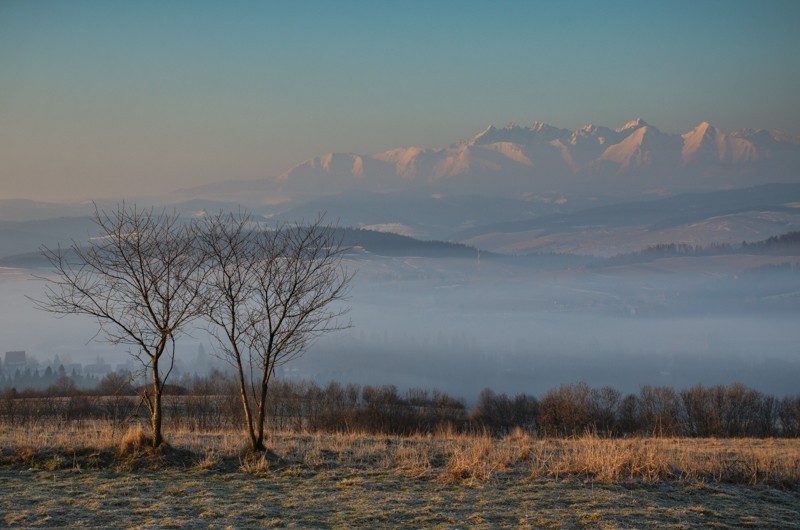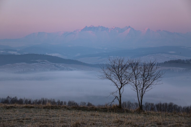 Słońce wstaje gdzieś nad Beskidem Sądeckim, ale tak naprawdę to, co najlepsze, dzieje się jeszcze przed jego pojawieniem. Czubki Tatr zaczynają subtelnie różowieć, bo ten wschód nie będzie jak wybuchy fajerwerków. Będzie mgielnie niemal do końca. A gdy słońce wreszcie wychodzi, barwy zaczynają znikać.