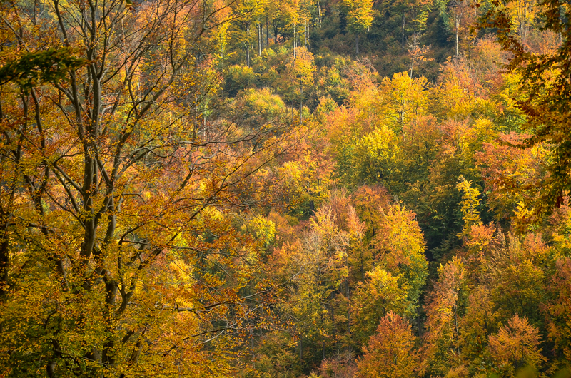 Ciszej robi się za przełęczą. Pogoda się poprawia i gdzieś tam po kolejnym podejściu, robię sobie przerwę pod poskręcanym bukowym drzewem. Przy powiewie wiatru liście spadają w dół; ciekawe, jak długo jesień się jeszcze utrzyma?