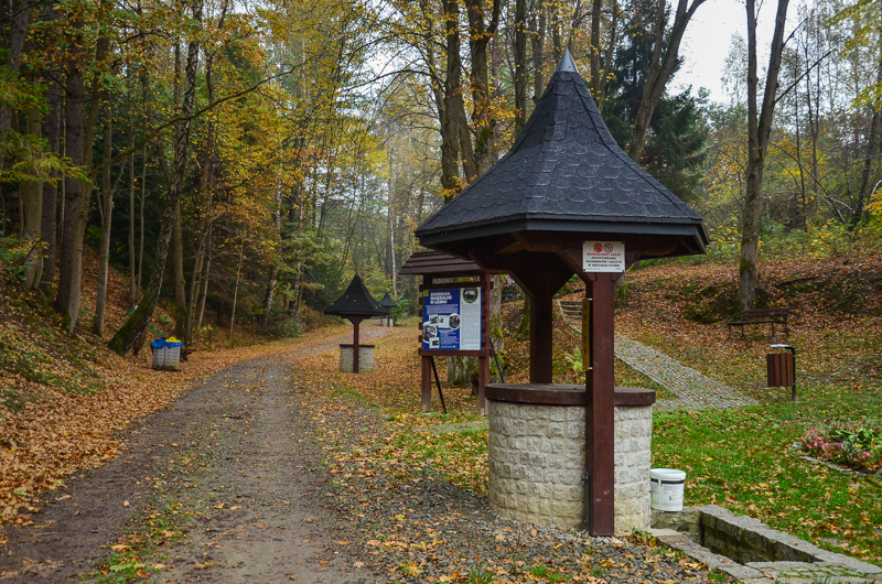 Za miastem czeka mnie jeszcze jedna atrakcja: źródełka mineralne. Miejsce z sześcioma studzienkami, figurą Matki Boskiej i kamieniem poświęconym Piłsudskiemu jest wyremontowane; cóż z tego, jeśli wody w źródłach praktycznie brak? Ciurczy się tylko „Antoni”, pozostałe wyschły.